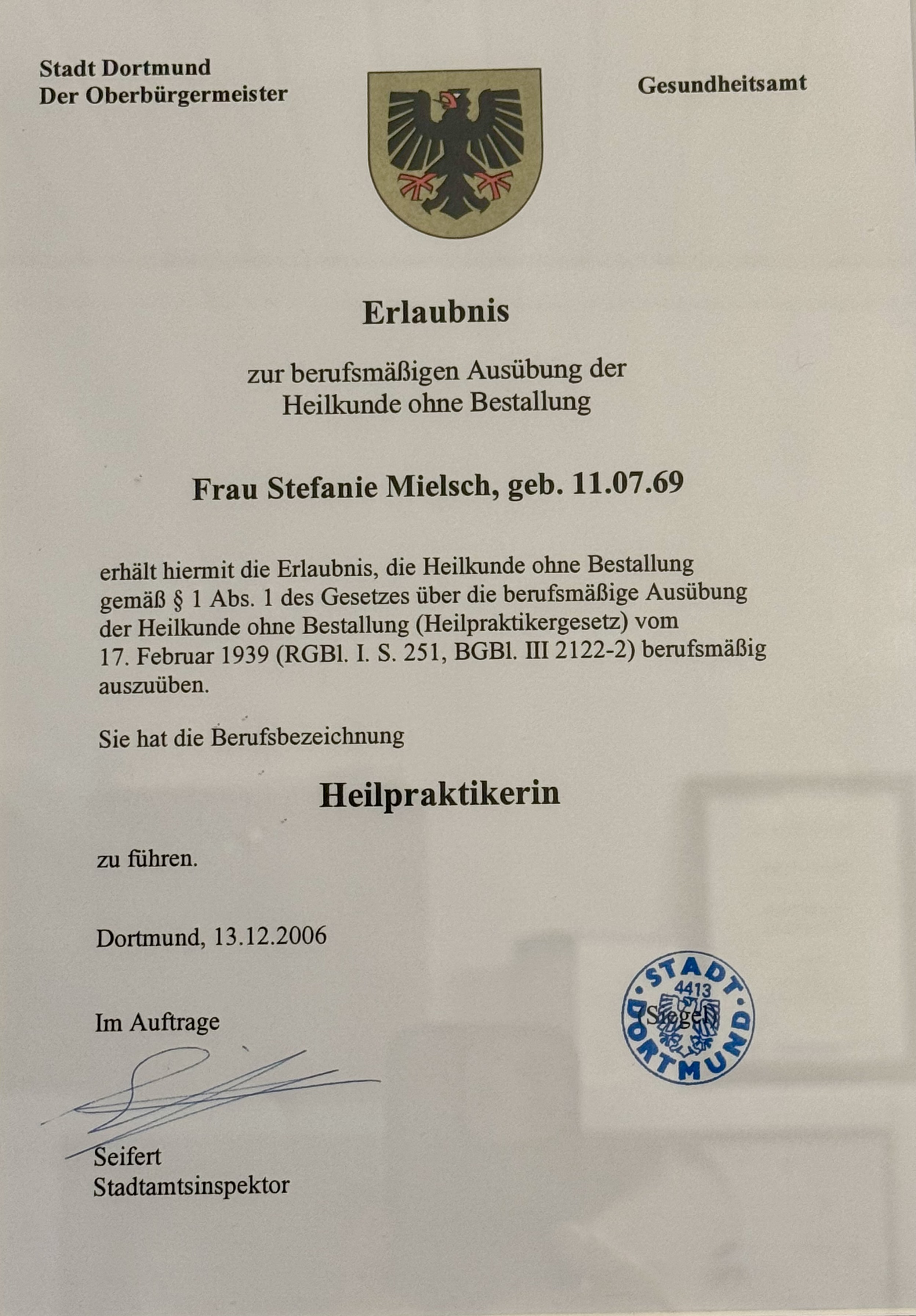 Heilpraktikergesetz „Gesetz über die berufsmässige Ausübung der Heilkunde ohne Bestallung“ vom 17.02.1939, geändert durch Art.53 des EGStGB vom 02.03.1974 (BGB1. I S.469). Die berufsrechtliche Regelung kann unter www.gesetze-im-internet.de und dort unter Stichwort/Titelsuche „Heilpraktikergesetz“ eingesehen werden.